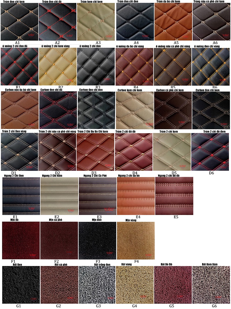 Ngoài mẫu thảm lót sàn 5D 6D trên quý khách có thể tham khảo và lựa chọn các mẫu khác trong bảng mẫu da của ONEAUTO trong bảng dưới đây.